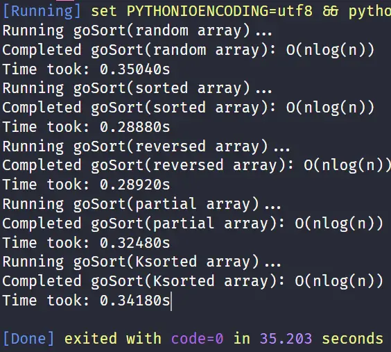 from bigO import BigO from bigO import algorithm lib = BigO() result = lib.compare(algorithm.bubbleSort, algorithm.insertSort, "reversed", 5000) result = lib.compare(algorithm.insertSort, algorithm.insertSortOptimized, "reversed", 5000) result = lib.compare(algorithm.quickSort, algorithm.quickSortHoare, "reversed", 50000) result = lib.compare(algorithm.timSort, algorithm.introSort, "reversed", 50000) result = lib.compare(sorted, algorithm.introSort, "reversed", 50000) result = lib.compare(algorithm.bubbleSort, algorithm.insertSort, "all", 5000) print(result) '''Result bubbleSort is 3.6% faster than insertSort on reversed case Time Difference: 0.04513s insertSortOptimized is 5959.3% faster than insertSort on reversed case Time Difference: 1.25974s quickSortHoare is 153.6% faster than quickSort on reversed case Time Difference: 0.09869s introSort is 206.6% faster than timSort on reversed case Time Difference: 0.12597s sorted is 12436.9% faster than introSort on reversed case Time Difference: 0.06862s Running bubbleSort(tests) vs insertSort(tests) insertSort is 32.6% faster than bubbleSort on 6 of 8 cases Time Difference: 0.11975s {'bubbleSort': 0.4875642249999998, 'insertSort': 0.3678110916666666} '''@utils.isSorted