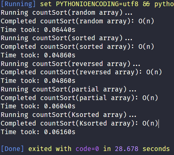 from bigO import BigO def countSort(arr): # stable # Time Complexity : O(n) | Space Complexity : O(n) minValue = min(arr) maxValue = max(arr) - minValue buckets = [0 for _ in range(maxValue + 1)] for i in arr: buckets[i - minValue] += 1 index = 0 for i in range(len(buckets)): while buckets[i] > 0: arr[index] = i + minValue index += 1 buckets[i] -= 1 return arr tester = BigO() complexity = tester.test(countSort, "random") # O(n) complexity = tester.test(countSort, "sorted") # O(n) complexity = tester.test(countSort, "reversed") # O(n) complexity = tester.test(countSort, "partial") # O(n) complexity = tester.test(countSort, "Ksorted") # O(n)